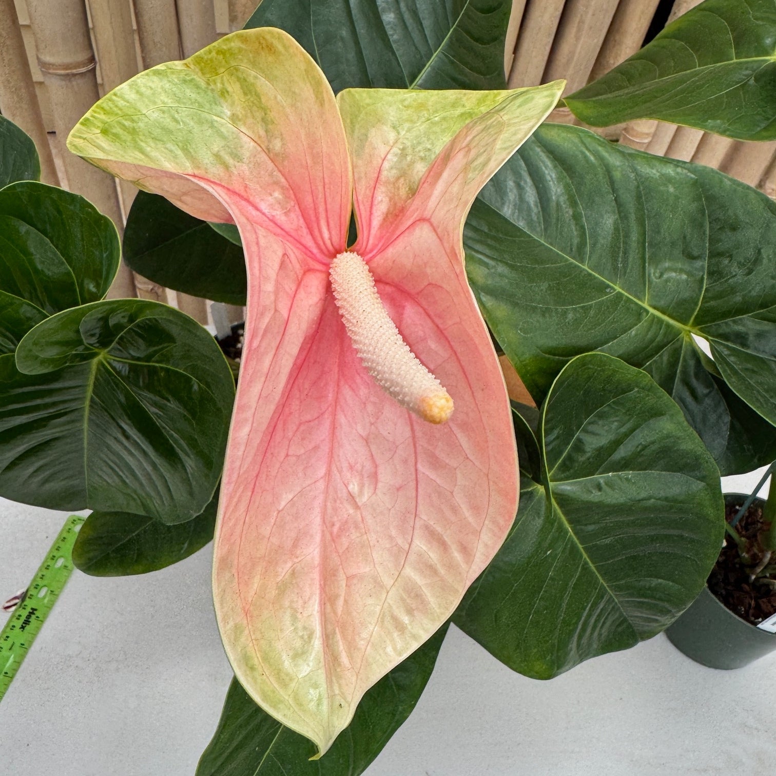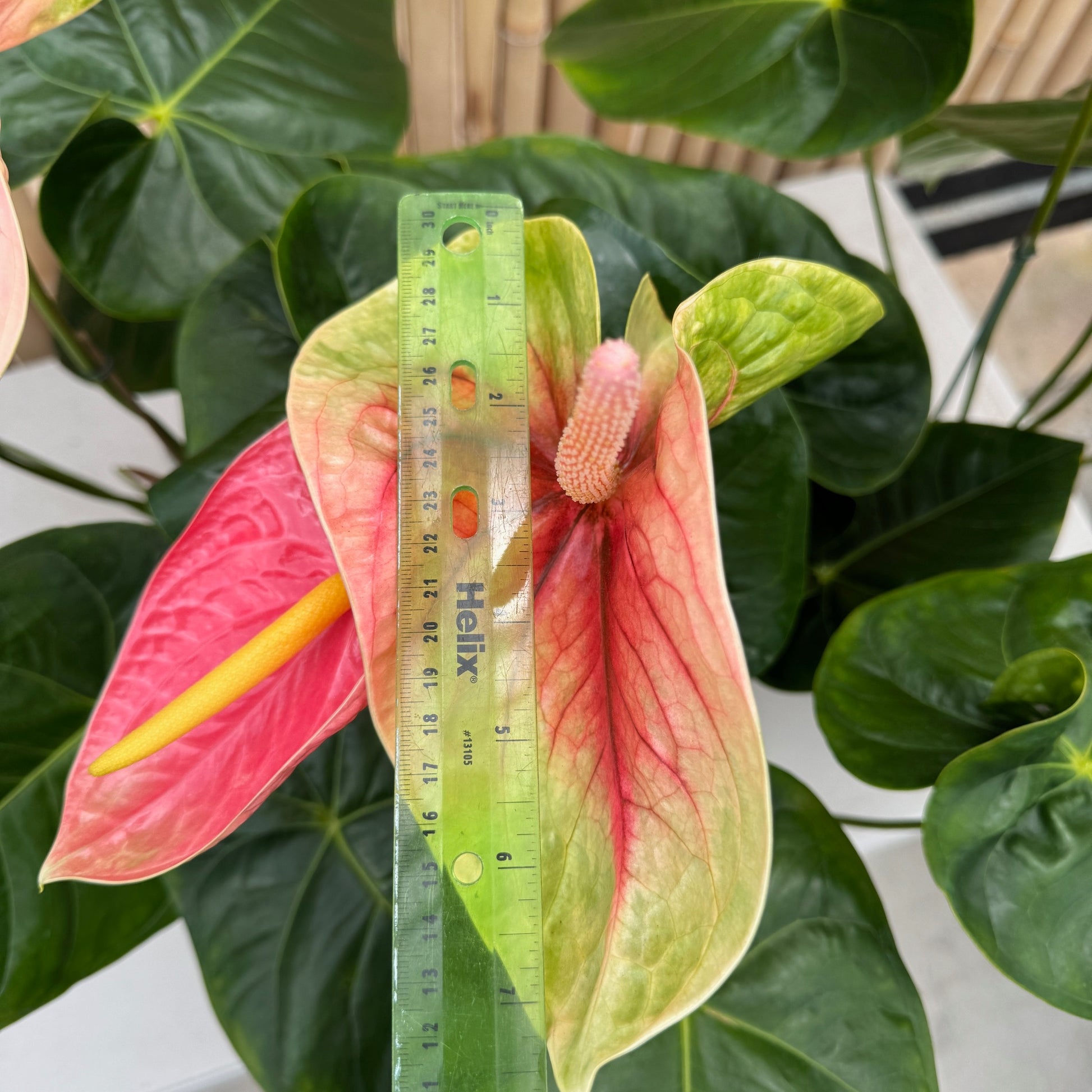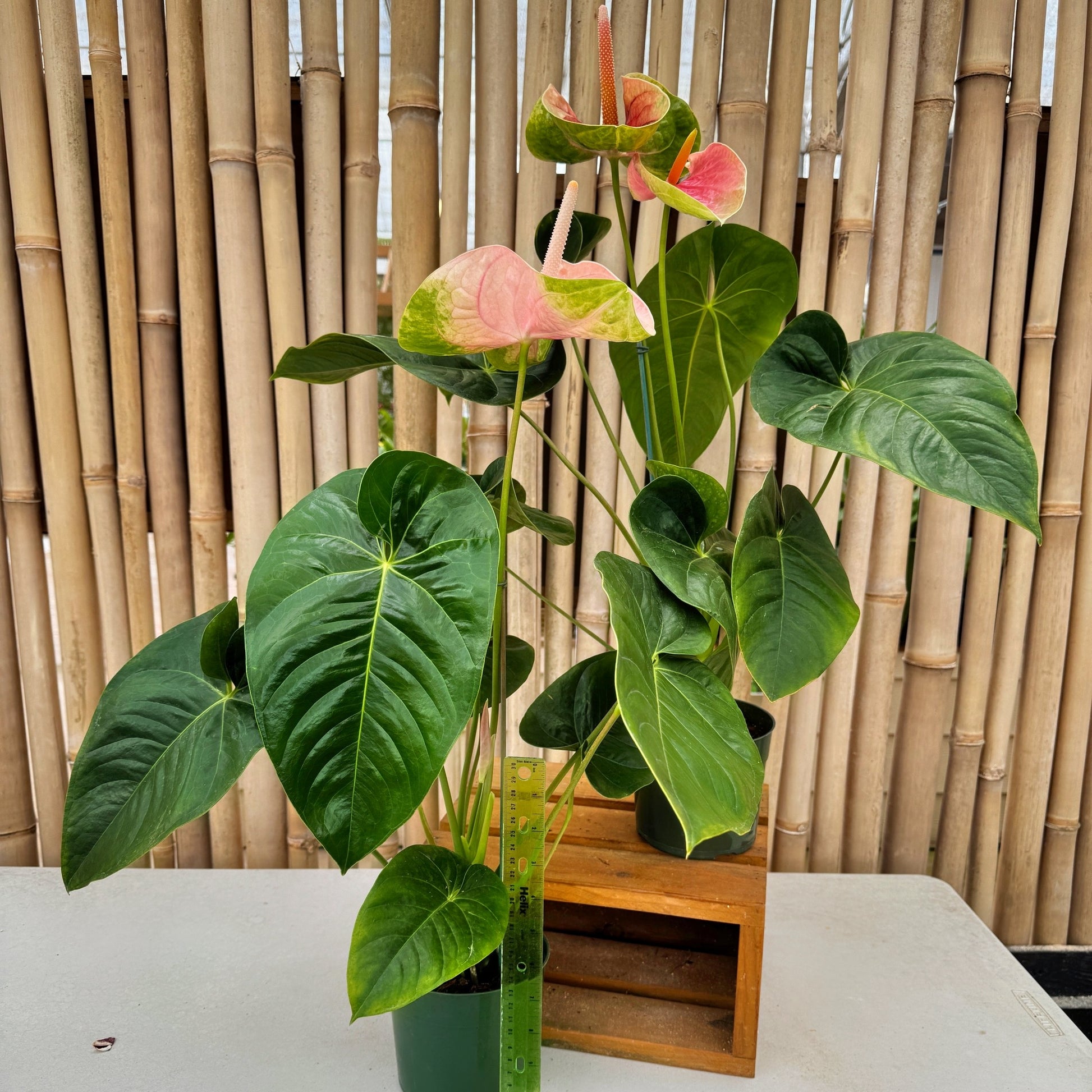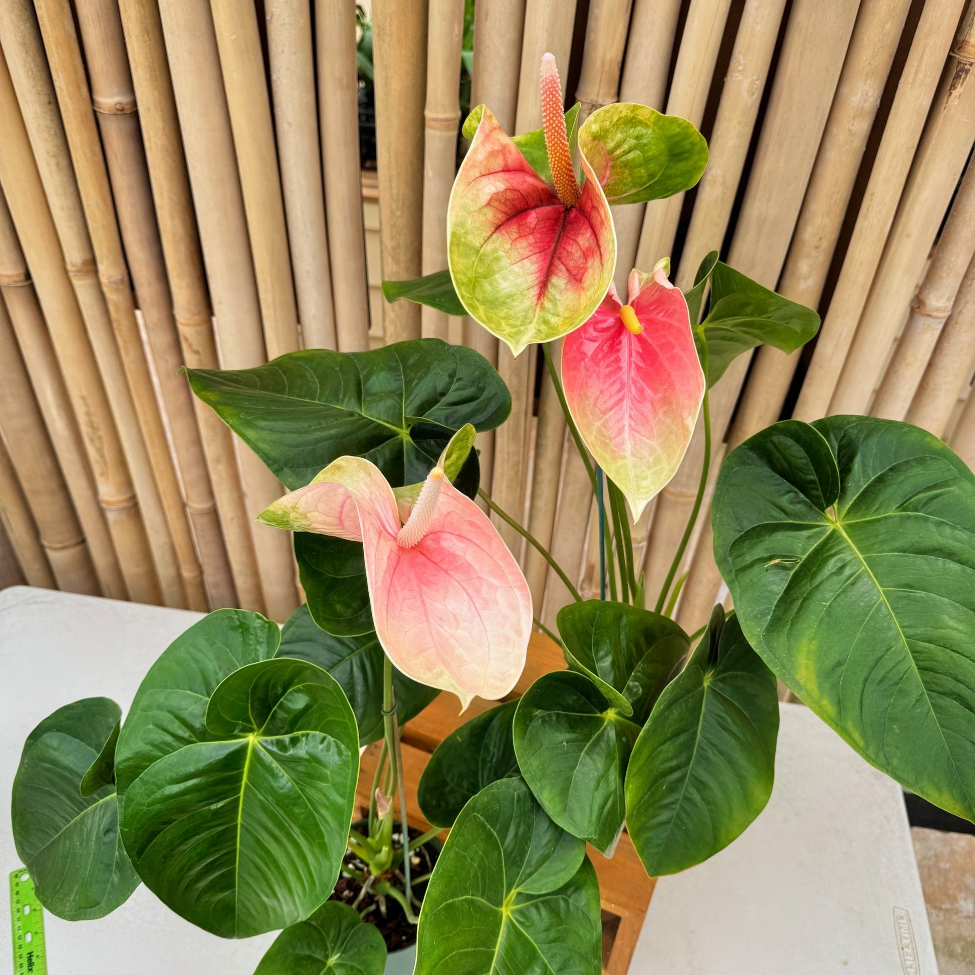 Anthuriums are often recognized in tropical cut flower arrangements. Many of these have been growing in the backyards in Hawaii for decades. Anthurium plants are durable and long lasting, easy to grow and great as an indoor houseplant. These specialty anthuriums are called "obake". Obake means to change or transform - as these plants have matured, solid color flowers evolve to have multicolors & veining.