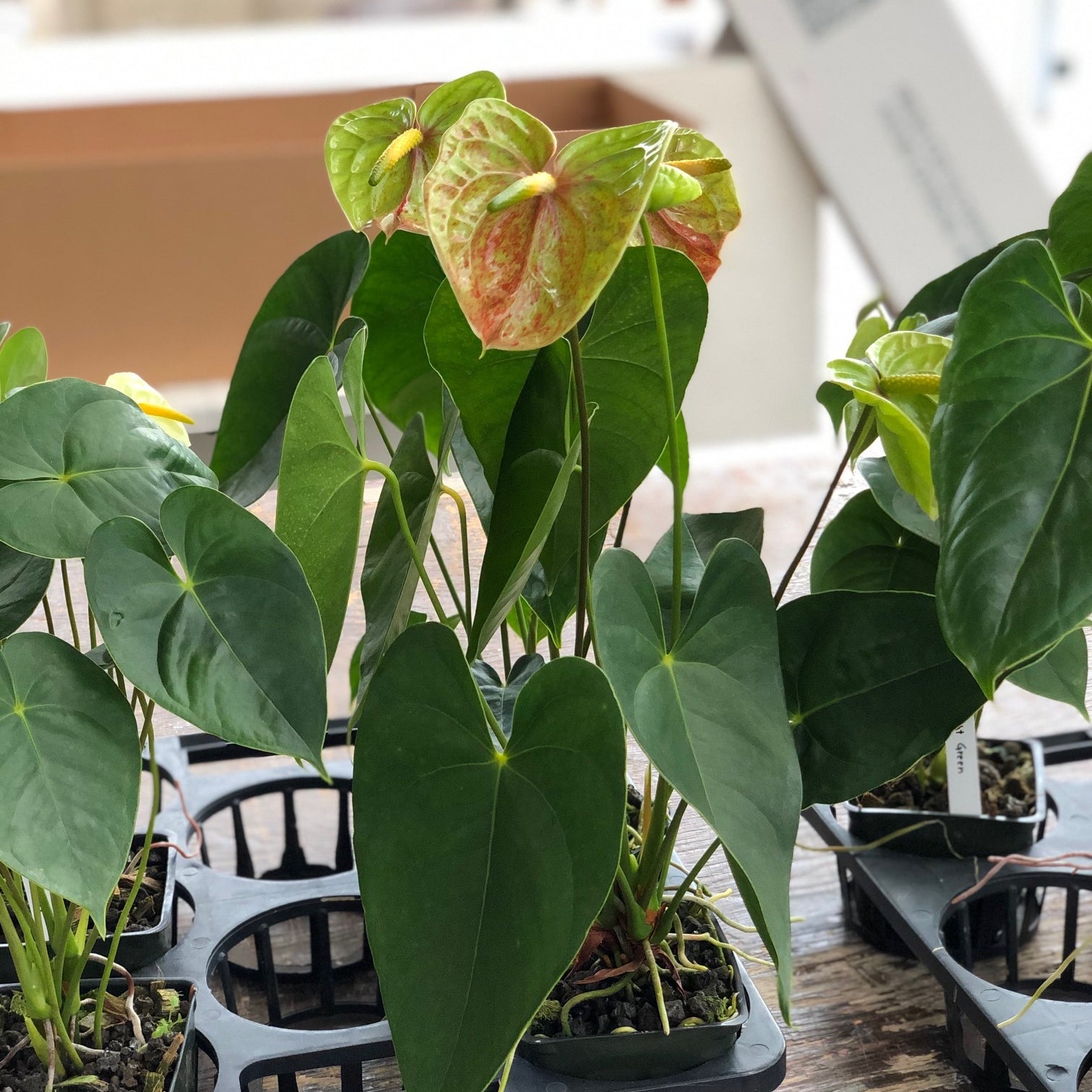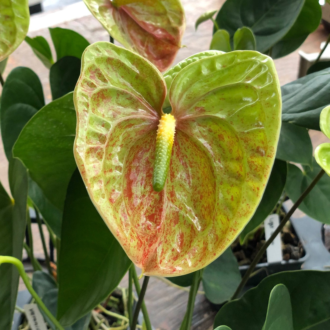 This green, speckled Anthurium Veronica plant is truly a unique wonder. Each bearing bright green "flowers" that have distinctive variations of red speckling throughout the flower so that no two flowers appear exactly like the next. Anthuriums are often recognized in tropical cut flower arrangements. Many of these have been growing in the backyards in Hawaii for decades. Known for their bright colored flower spathes, anthuriums comes in many different colors and shapes. Anthurium plants are durable and long lasting, easy to grow and great as an indoor houseplant. They can produce long lasting flowers all year round.