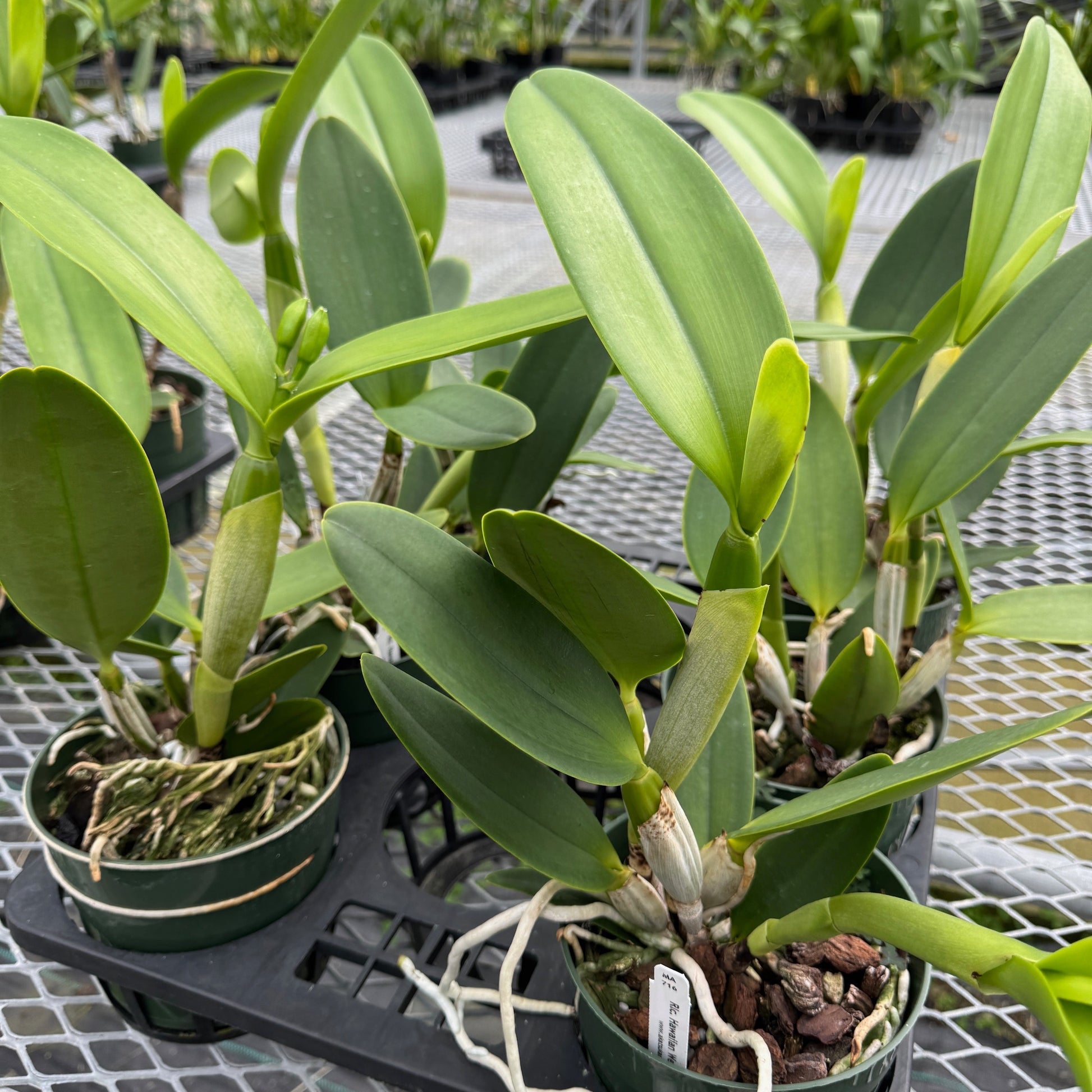 Elevate your orchid collection with this refined and elegant Cattleya: the award-winning Cattleya Hawaiian Wedding Song 'Virgin' HCC/AOS. It features pristine snow-white blooms and a lovely fragrance.