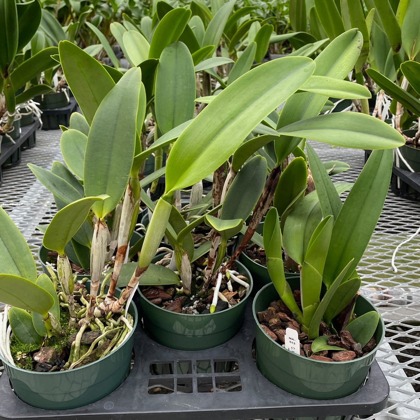 This large cattleya orchid mericlone, C. Hawaiian Wedding Song 'Virgin' produces large, classy, white orchid flowers when in bloom. The parental cross for this clone is C. Angel Bells x C. Claesiana.