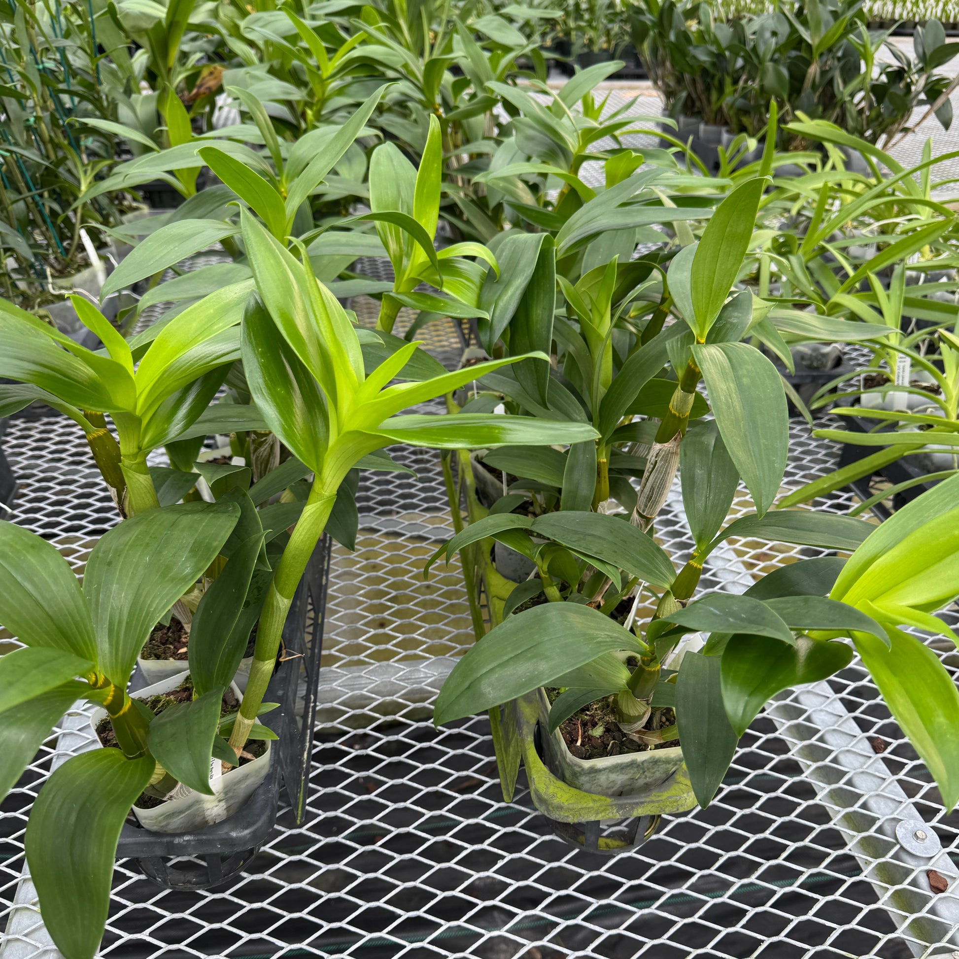 This Latouria dendrobium has parentage in Den. Peter Shen x Den. spectabile. Full foliage and blooming size.