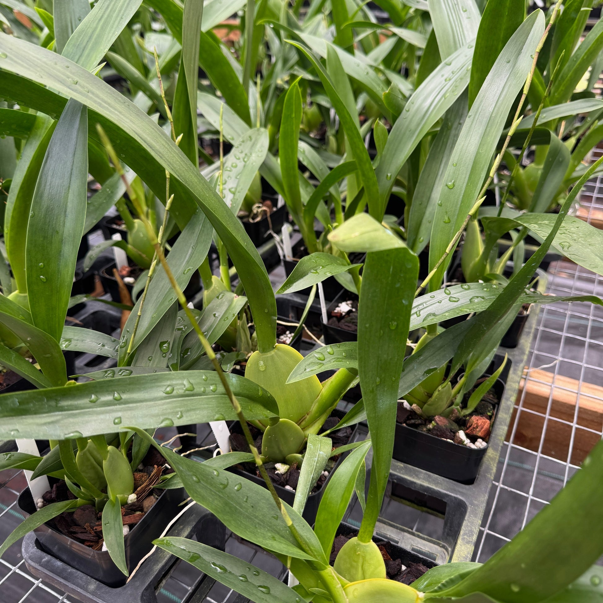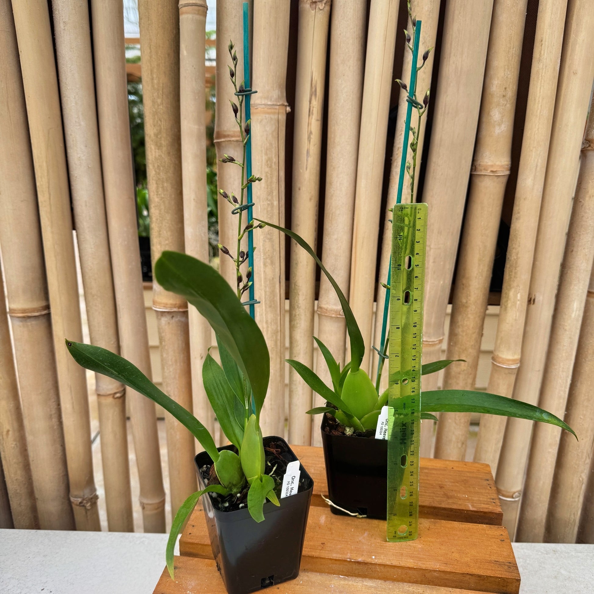 The Oncidium Heaven Scent 'Redolence' produces numerous tiny 1" brown and white dancing ladies that emit a wonderfully sweet, chocolate fragrance. This amazingly unique chocolate orchid is certainly an all-time favorite for orchid growers and chocolate lovers alike. A new batch is establishing itself and producing first blooms. As plant continues to mature, spikes will be taller and filled with more flowers.