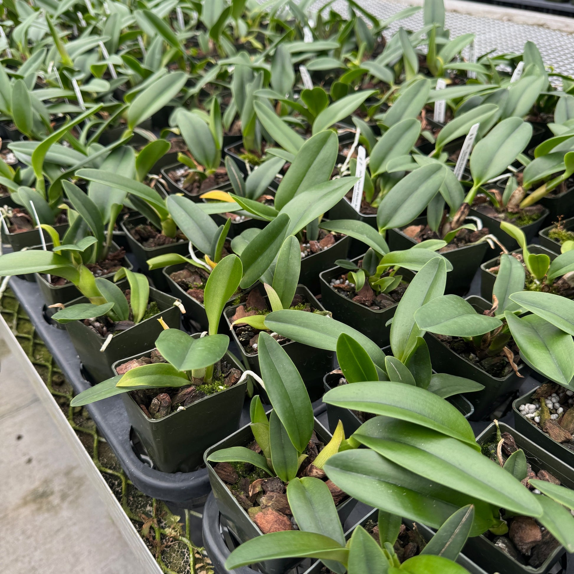 Rhyncholaeliocattleya (Rlc.) David Wynn Miller 'Volcano Beauty' is a breathtaking original cattleya hybrid in a vibrant red hue from our breeding collection. A choice result of the cross between the beautiful Rlc. Memoria Yoshi Tsubaki and Cattleya Wendy's Valentine, this orchid will grow to produce bright red orchid flowers with a splash of gold at the center of its lip. These young orchid plants are mericlones and are perfect to add to any growing orchid collection.