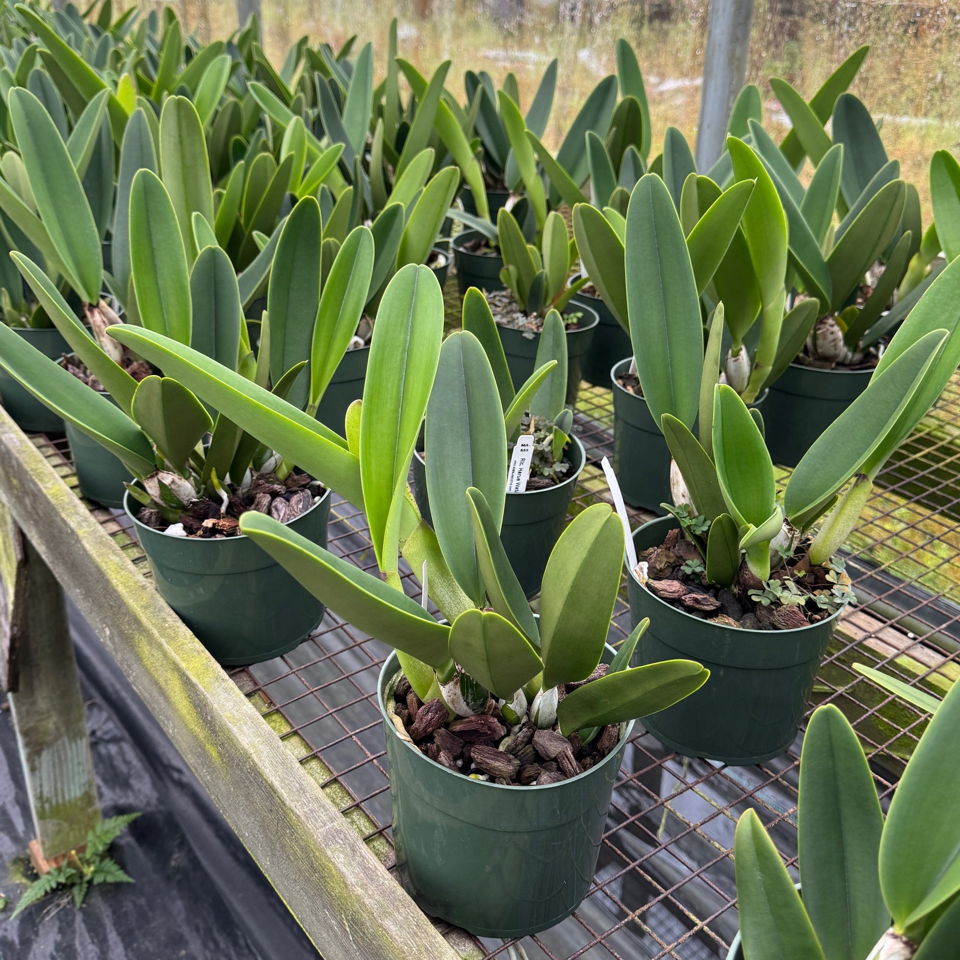 This showstopping, large, cattleya orchid, Rlc. Harue Watanabe 'Volcano Queen' is a newly re-released Akatsuka original hybrid cross that produces fragrant and sizeable white flowers with a vibrant, byzantium pink lip during blooming season, as seen in the photo.