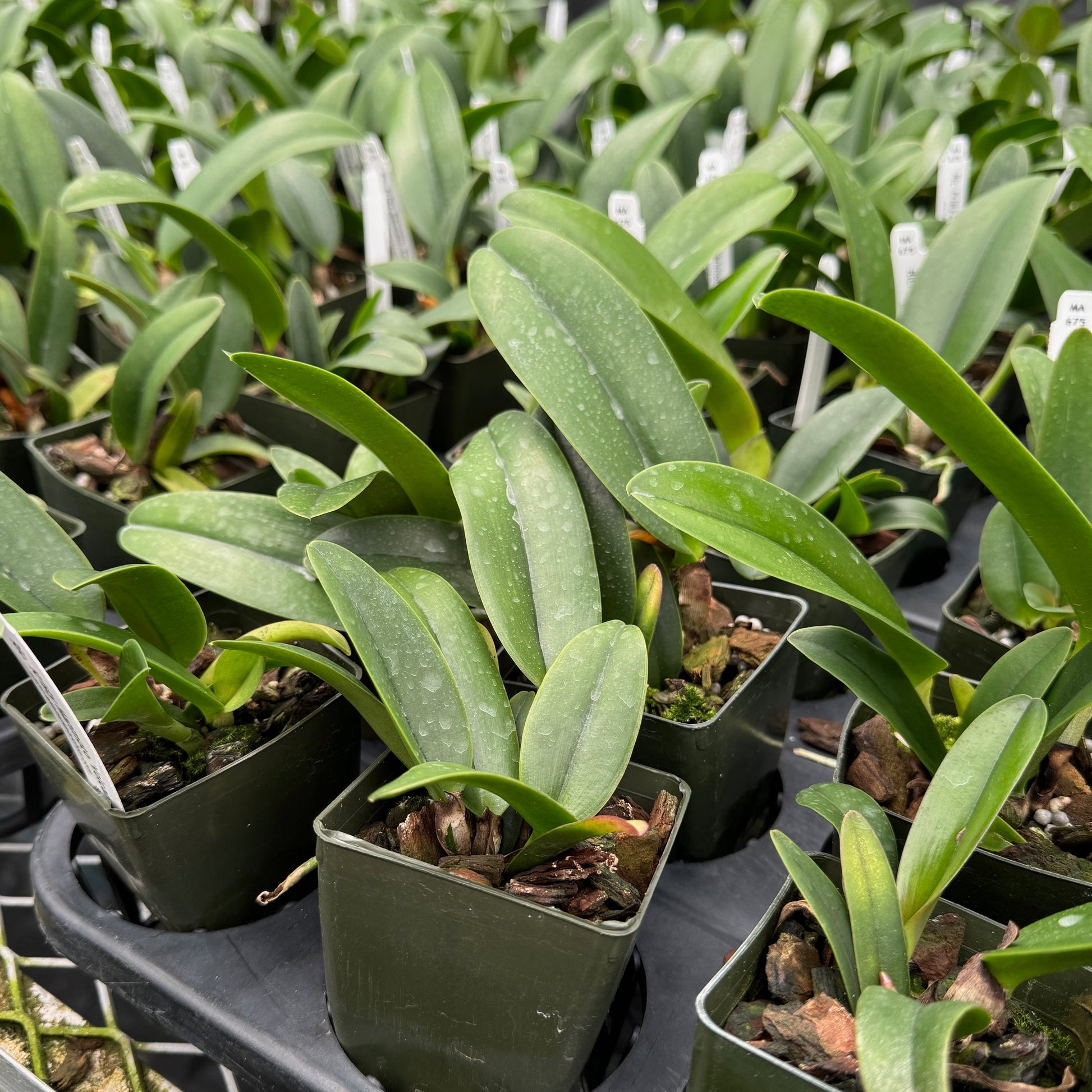 Rhyncholaeliocattleya (Rlc.) Kristy Manmoto 'Volcano Red' is an original cattleya hybrid from our breeding collection. This orchid produces vibrant red orchid flowers with a yellow glow in the center of its red lip. These young orchid plants are mericlones and are perfect to add to any growing orchid collection.
