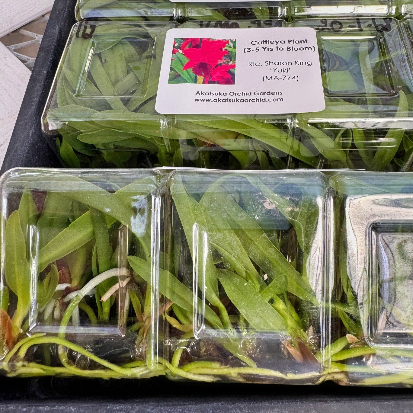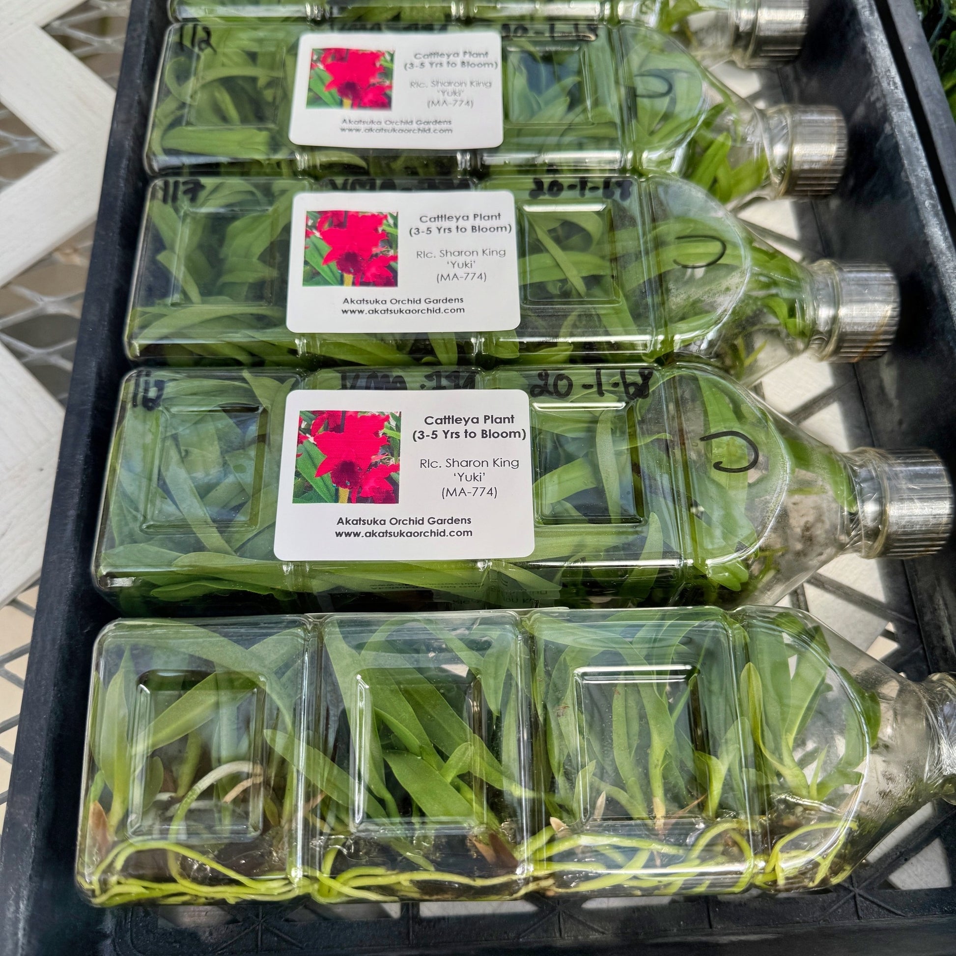This red cattleya orchid, Rhyncholaeliocattleya (Rlc.) Sharon King 'Yuki' is a tried and true hybrid. Named after a friend, Mori enjoys having this variety in our collection. Now available as "keiki" in flask with each flask containing numerous young plants. It should be noted that these plants are mericlones, which means that you will receive a treasure chest of at least 35 young plants that will, under ideal growing and blooming conditions, grow to produce blooms that will look nearly identical to those pictured in the sample photo.