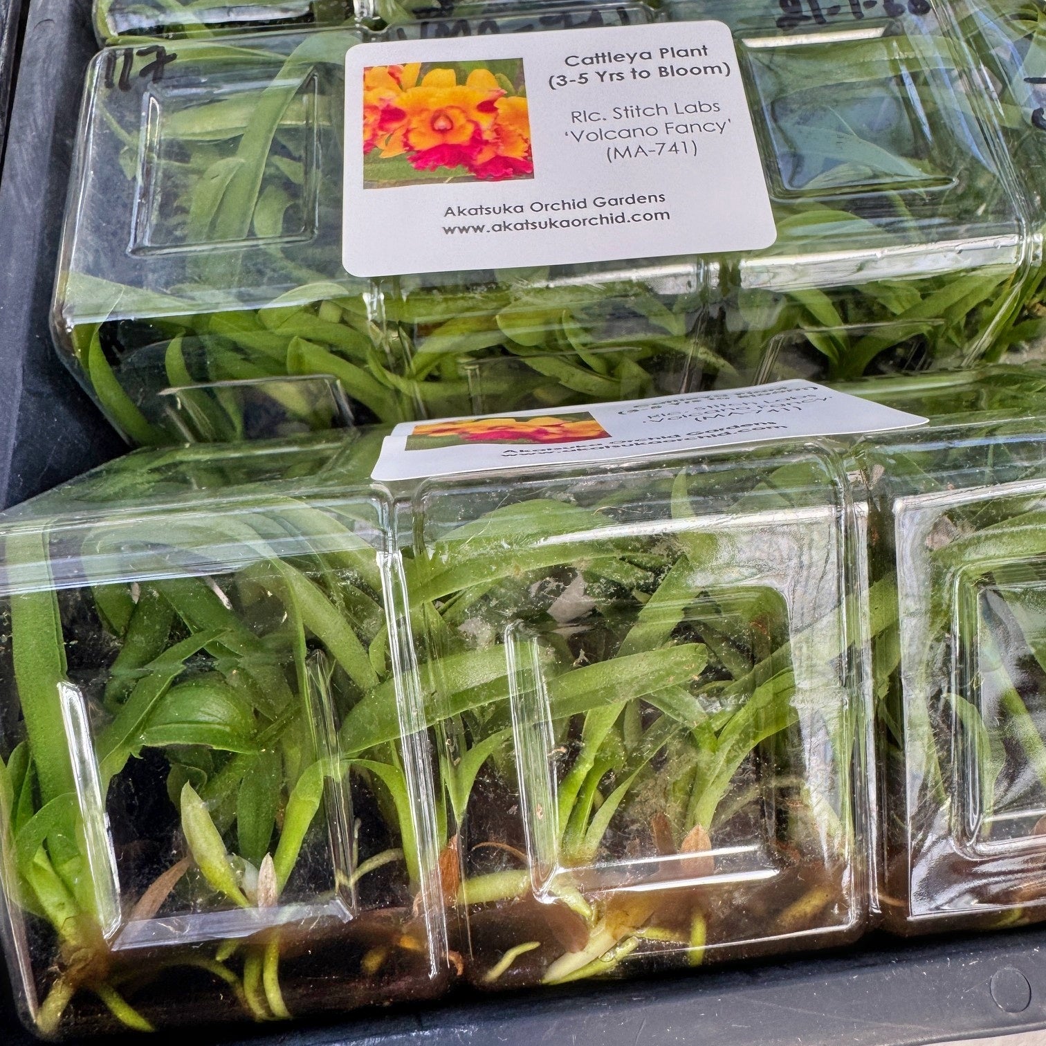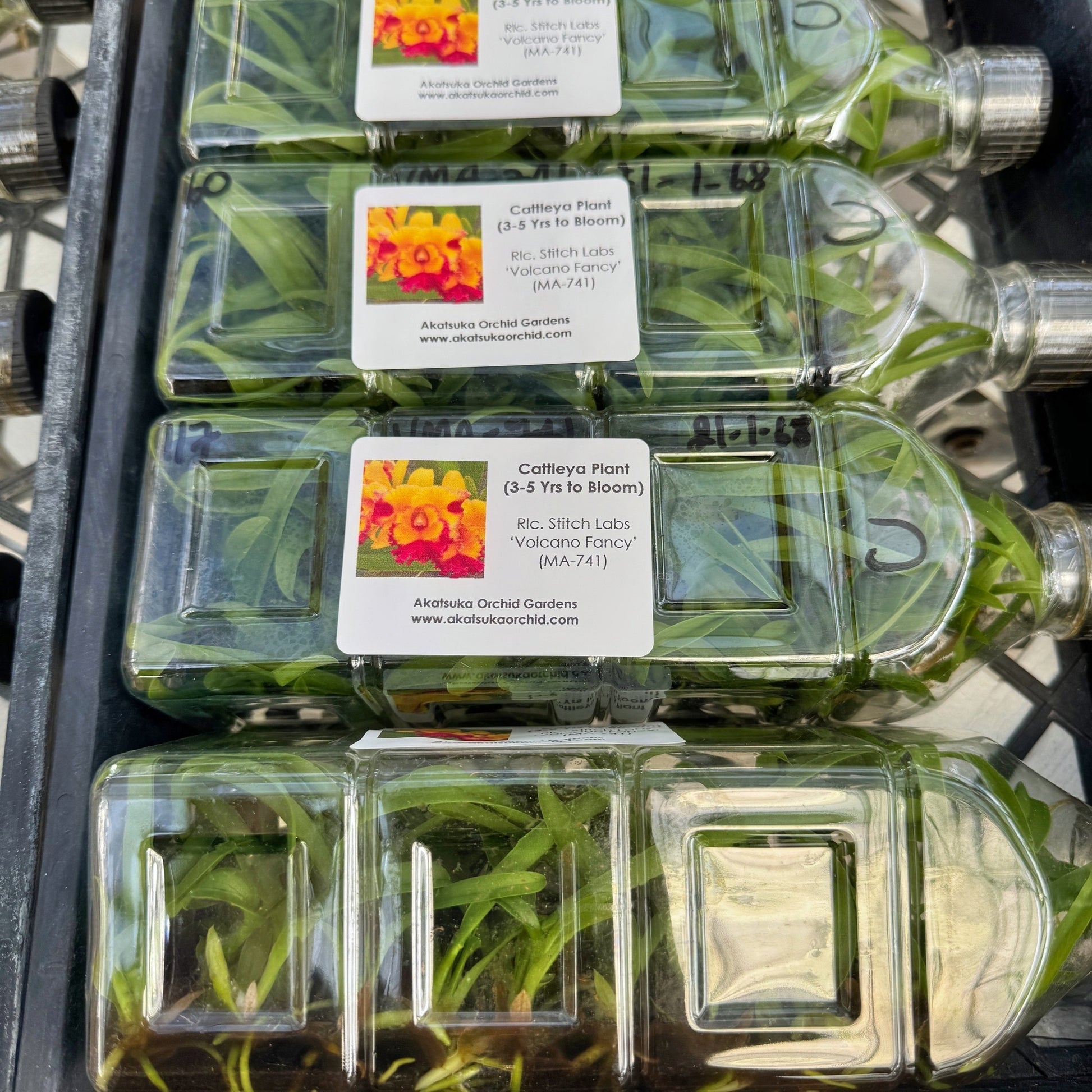 This multi-tonal cattleya orchid, Rhyncholaeliocattleya (Rlc.) Stitch Labs 'Volcano Fancy' is one of 3 in a seedling batch selected for cloning. Which means we found amazing variations from this cross. Now available as "keiki" in flask with each flask containing numerous young plants. It should be noted that these plants are mericlones, which means that you will receive a treasure chest of at least 35 young plants that will, under ideal growing and blooming conditions, grow to produce blooms that will look nearly identical to those pictured in the sample photo.