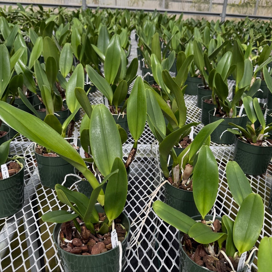 This mericlone, Rlc. Volcano Feeling 'Volcano Queen' is now available at a mature blooming stage and is not currently producing any buds and blooms. This orchid is planted in a 5 1/2” pot and will produce 4-5” cattleya flowers as shown in the product photo while in bloom. Cattleyas are often annual bloomers. This variety tends to produce orchid flowers consistently during the fall to winter months. This plant is currently not in bud or flowering now. General orchid care for Cattleyas include a temperature range of 75-85F during the day and 60F at night. 40-60% humidity is recommended. Bright, shaded light south-east or south-west exposure. Check the media and water only when dry (about 1-2 times/week). We recommend fertilizing with a high phosphorus & potassium slow release blend to develop big blooms. As with all orchids, good air movement is essential. Repot these mature size orchids every 2 years. Growing instructions are included with every order. Contact us daily via email or phone for additional care questions or concerns.