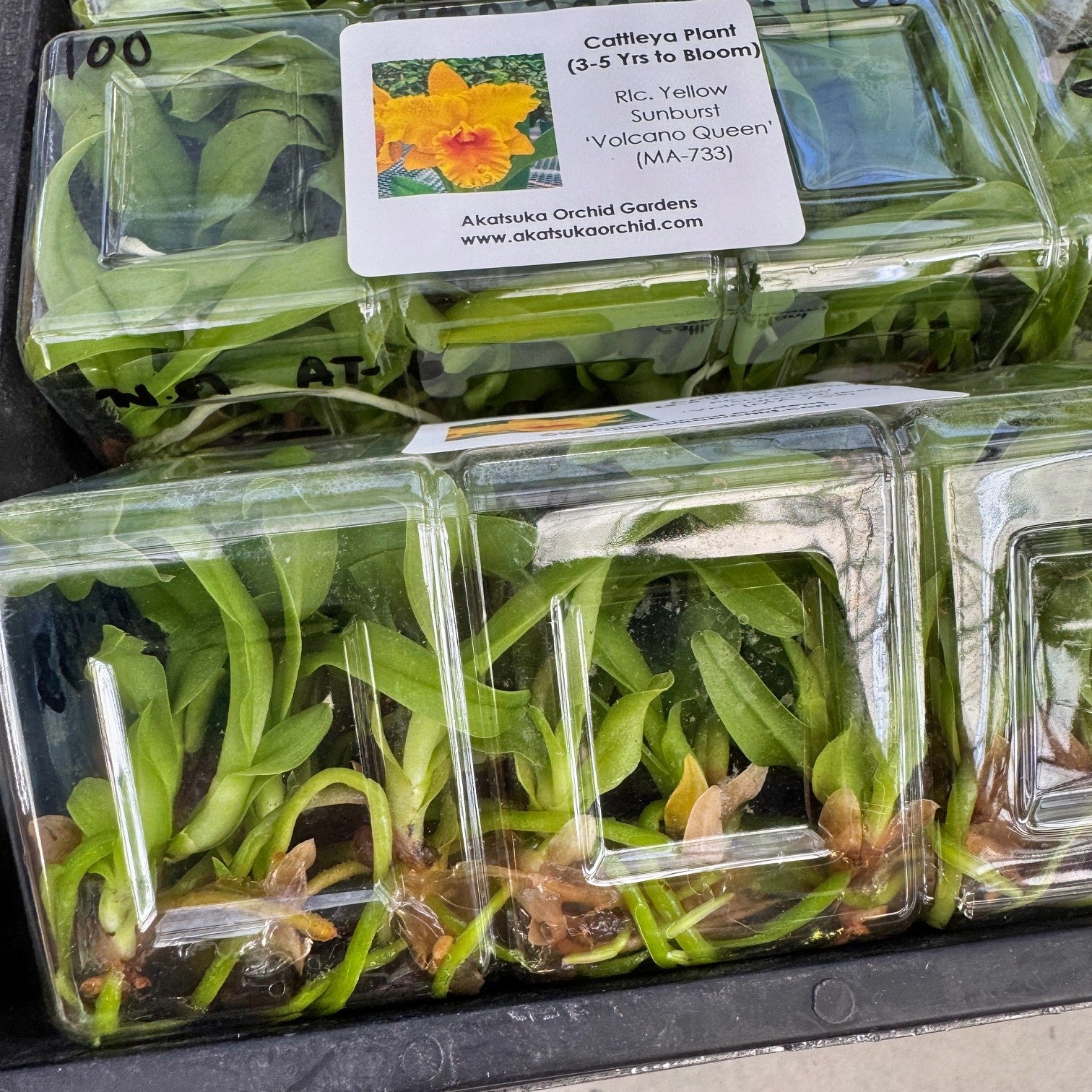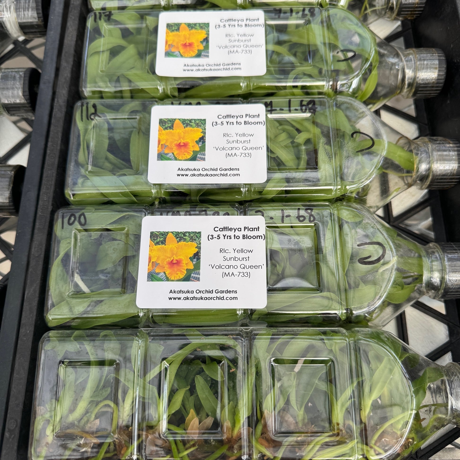 This golden cattleya orchid, Rhyncholaeliocattleya (Rlc.) Yellow Sunburst 'Volcano Queen' is the cream of the crop from this seedling hybrid. This new variety meets the standards to be crowned a Volcano Queen in our original collection of hybrids. Now available as "keiki" in flask with each flask containing numerous young plants. It should be noted that these plants are mericlones, which means that you will receive a treasure chest of at least 35 young plants that will, under ideal growing and blooming conditions, grow to produce blooms that will look nearly identical to those pictured in the sample photo.